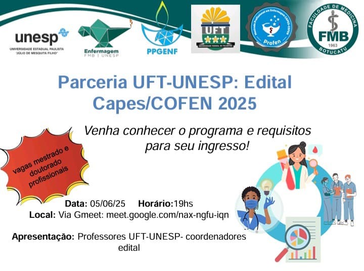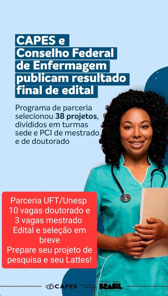 O Curso de Enfermagem da Universidade Federal do Tocantins (UFT), em parceria com o Programa de Pós-Graduação em Enfermagem da Faculdade de Medicina de Botucatu da Universidade Estadual Paulista (UNESP), obteve aprovação de dois projetos no Programa de Financiamento da Coordenação de Aperfeiçoamento de Pessoal de Nível Superior (Capes) e do Conselho Federal de Enfermagem (Cofen).