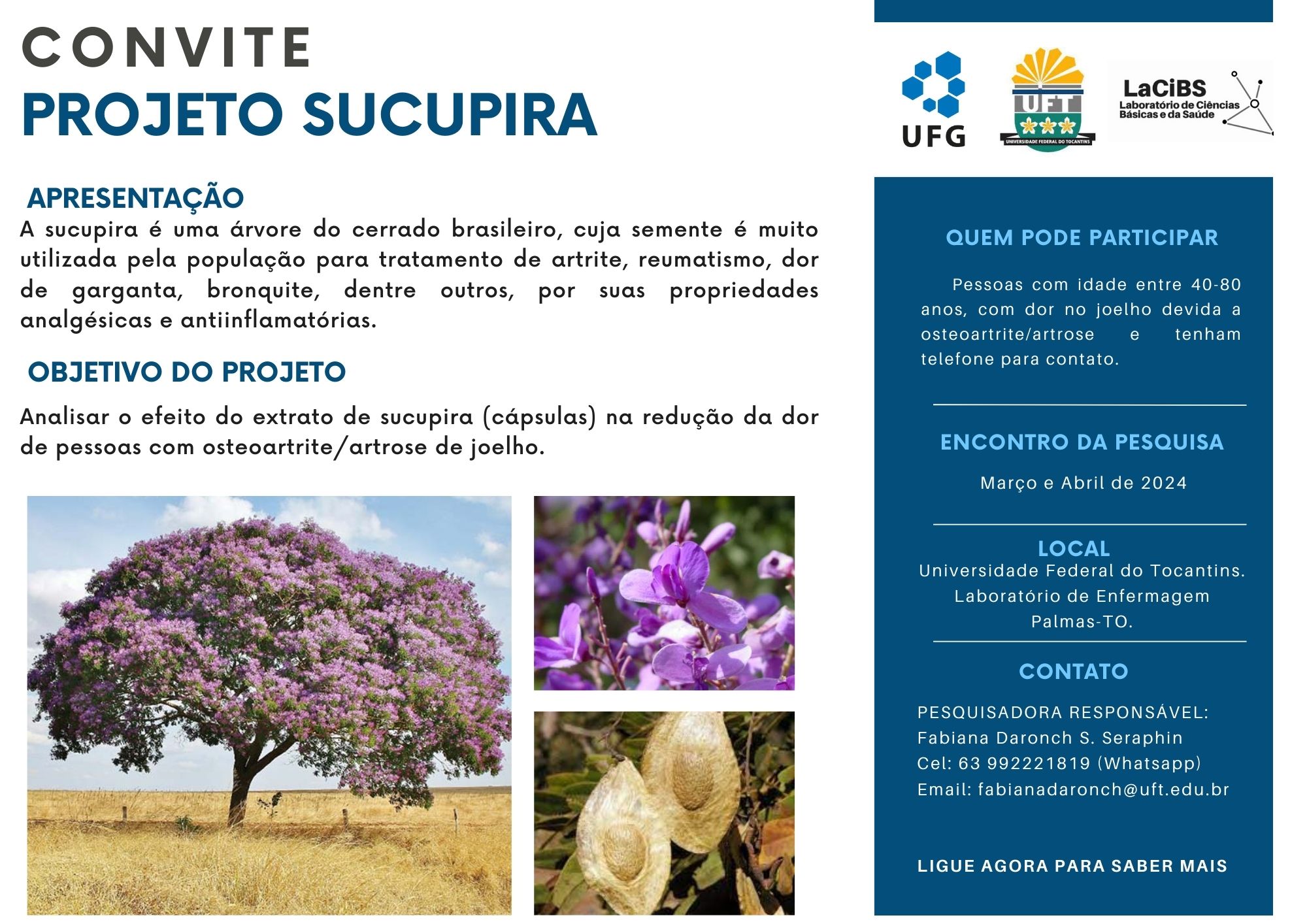 Pesquisadores da Universidade Federal do Tocantins (UFT) e da Universidade Federal do Goiás (UFG) convidam interessados em participar de pesquisa que objetiva analisar o efeito do extrato seco padronizado da Sucupira-branca (Pterodon emarginatus) no alívio da dor crônica em pessoas com osteoartrite de joelho.