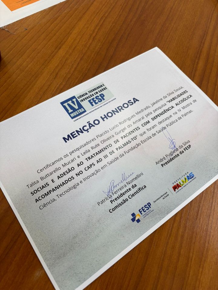 "A pesquisa científica realizada com os pacientes com dependência de álcool mostrou a importância de compreender os fatores que impactam a adesão ao tratamento para o alcoolismo. Receber a menção honrosa da IV Mostra da Fesp de Palmas/TO reforça todo o empenho, dedicação e cuidado ético que nós, pesquisadores, dispomos durante todo o processo da pesquisa", afirmou Plácido.