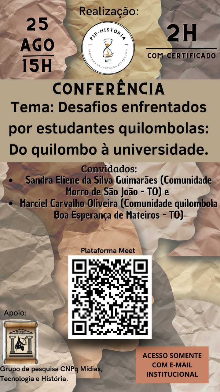 O Programa de Inovação Pedagógica do Curso de História, do Câmpus da UFT em Porto Nacional, vai promover na próxima quinta-feira, 25 de agosto, às 15h, a mesa-redonda intitulada “Desafios enfrentados por estudantes quilombolas: do quilombo à Universidade''. A atividade, que é coordenada pelo professor George Leonardo Seabra Coelho, vai ser realizada via Google Meet.