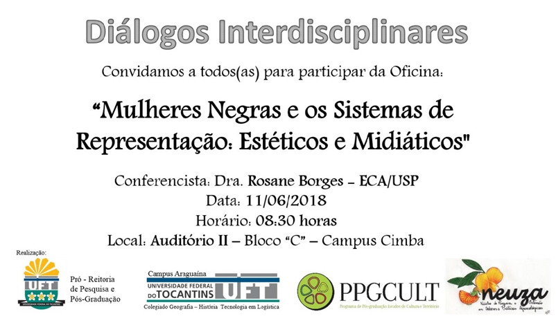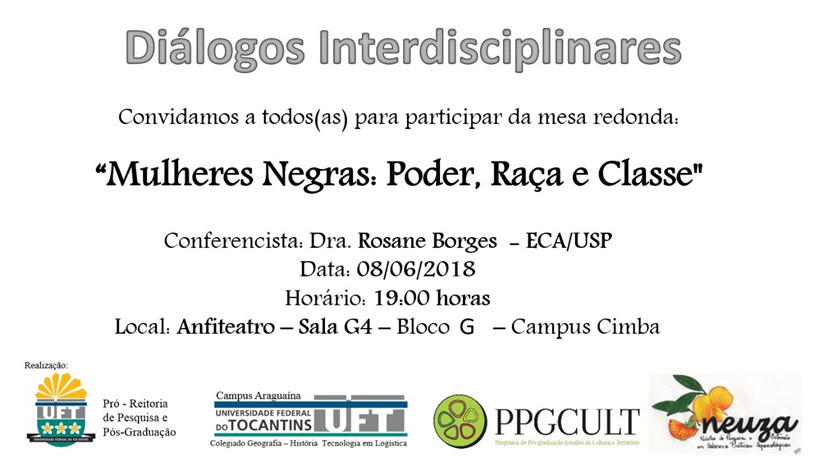 O evento “Diálogos Interdisciplinares” será realizado nesta sexta-feira (08) às 19h na Unidade Cimba do Câmpus da UFT de Araguaína. Uma mesa-redonda será realizada no evento, comandada pela conferencista e professora Rosane Borges (veja quadro). O tema da mesa será “Mulheres Negras: Poder, raça e classe”.