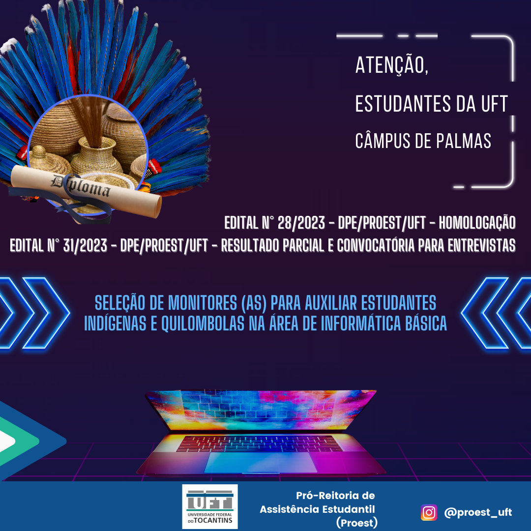 A Pró-Reitoria de Assistência Estudantil da UFT (Proest), Câmpus de Palmas, divulgou, nesta sexta-feira (07), o edital de homologação das inscrições do Projeto Integrado de Permanência de Estudante Indígena e Quilombola (Piqui/ Ação de Inclusão Digital) e o resultado parcial da convocatória para entrevista.
