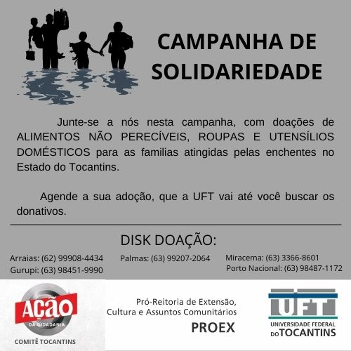 A Pró-Reitoria de Extensão, Cultura e Assuntos Comunitários (Proex) da Universidade Federal do Tocantins (UFT), em parceria com o Projeto Ação da Cidadania, está desenvolvendo uma Campanha Solidária para ajudar as famílias atingidas pelas enchentes provocadas pela cheia do rio Tocantins e seus afluentes. O objetivo da campanha é amenizar as perdas das mais de 800 pessoas afetadas pelas cheias no Estado, por meio da doação de alimentos não perecíveis, roupas e utensílios domésticos.