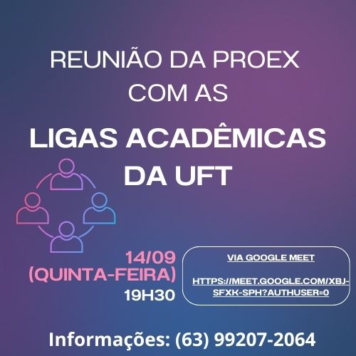 A Pró-Reitoria de Extensão, Cultura e Assuntos Comunitários - Proex, realizará nesta quinta-feira (14), às 19h30, uma reunião com as Ligas Acadêmicas da UFT, para fins de planejamento de apoio e discussão da minuta da resolução das Ligas Acadêmicas da UFT.
