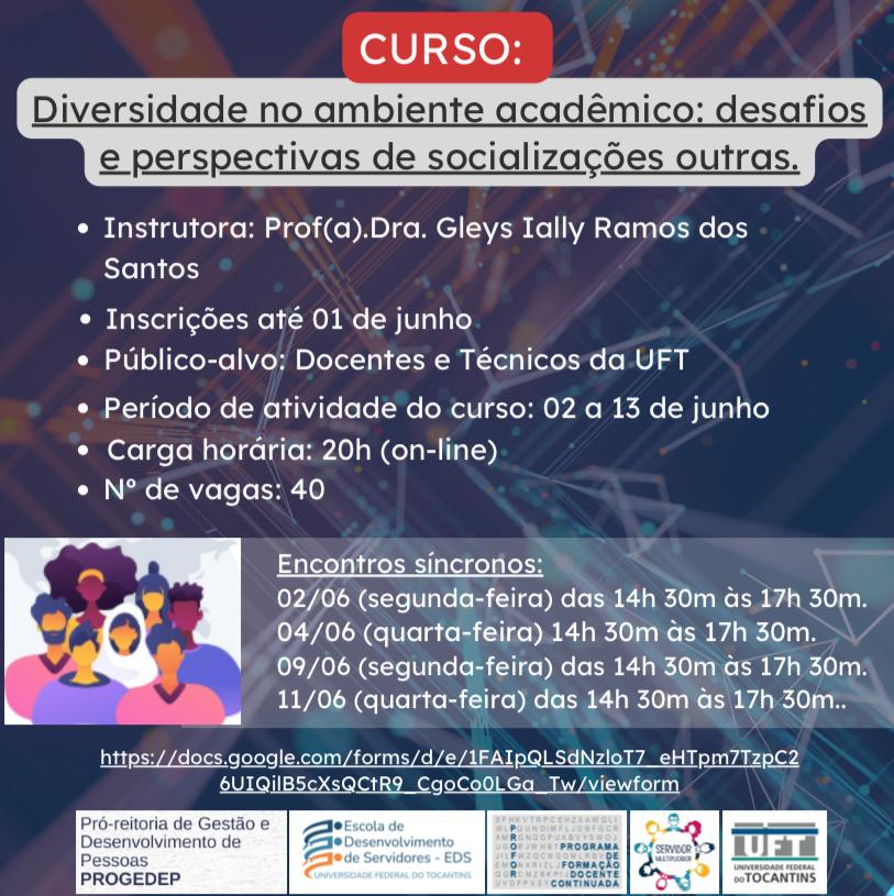 A Escola de Desenvolvimento dos Servidores (EDS), por meio do Programa de Formação Docente Continuada (Profor), está com inscrições abertas para o curso “A diversidade no ambiente acadêmico: desafios e perspectivas de socializações outras”. O curso, que será ofertado na modalidade remota, ocorrerá entre os dias 2 e 13 de junho de 2025, com carga horária de 20 horas. As inscrições podem ser feitas até o dia 1º de junho por meio de formulário online. A professora Gleys Ially Ramos dos Santos será a responsável pela condução da formação.