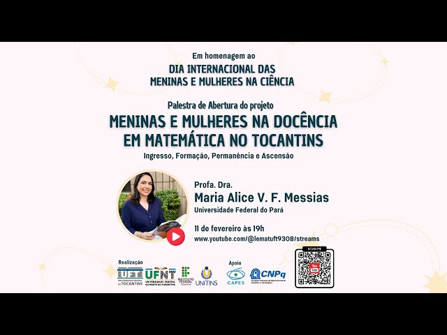 Para celebrar o Dia Internacional de Mulheres e Meninas na Ciência, o projeto “Meninas e Mulheres na Docência em Matemática no Tocantins: Ingresso, Formação, Permanência e Ascensão” realizará um evento de abertura no dia 11 de fevereiro de 2024, às 19h, com transmissão ao vivo pelo YouTube. O evento marca o início de uma série de ações que buscam fortalecer a participação feminina em ciências exatas e tecnologia.