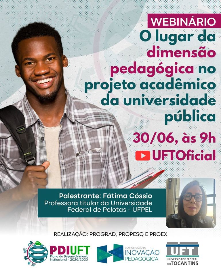 Como parte das ações iniciais dos Grupos de Trabalho responsáveis pela construção do novo Plano de Desenvolvimento Institucional (PDI) da Universidade Federal do Tocantins (UFT), a Pró-Reitoria de Graduação (Prograd), por meio da Coordenadoria de Inovação Pedagógica (CIP), promove o webinário "O lugar da dimensão pedagógica no projeto acadêmico da universidade pública". O evento será realizado no dia 30 de junho de 2025 (segunda-feira), às 9h, com transmissão ao vivo pelo canal oficial da UFT no YouTube.