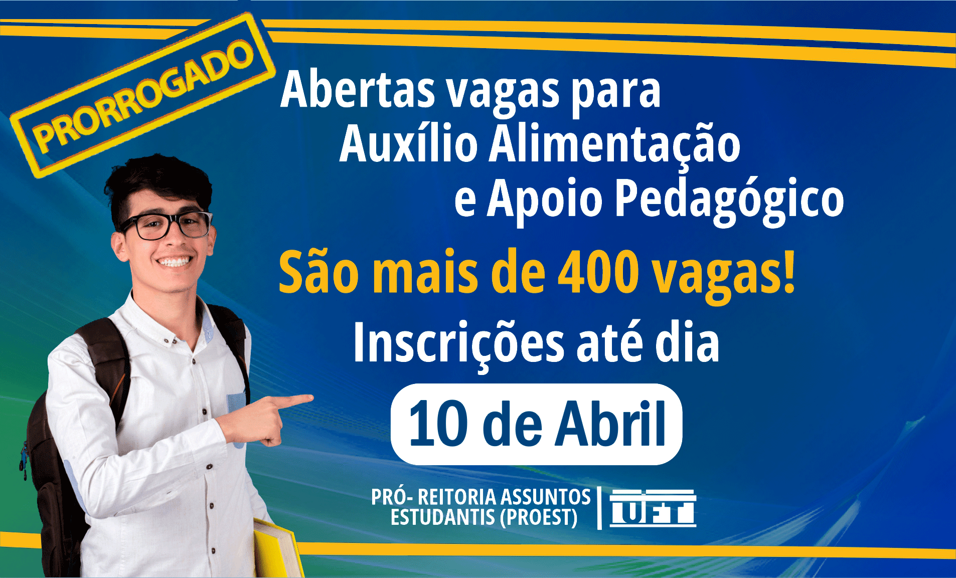 Mais de 400 vagas para os Programas de Auxílio Alimentação e Auxílio Apoio Pedagógico estão abertas. As inscrições foram prorrogadas e podem ser feitas através da página do CUBO, até o dia 10 de abril de 2022.