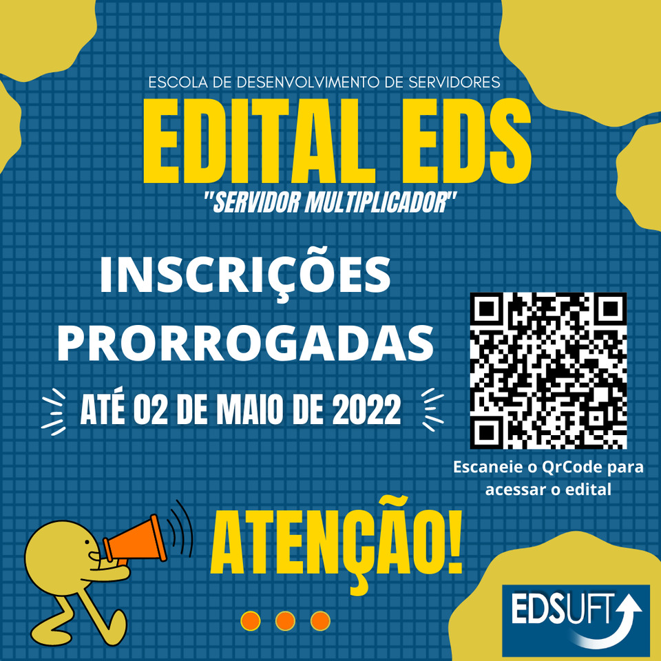 O prazo para cadastro de servidores da UFT interessados em participar do Edital de Seleção de Instrutores/Cursos para o Banco de Cursos da Escola de Desenvolvimento de Servidores da UFT (EDS-UFT), para o biênio 2022-2023, foi prorrogado. A Diretoria de Desenvolvimento de Pessoas da Pró-Reitoria de Gestão e Desenvolvimento de Pessoas (DDP/Progedep) publicou um Edital de Retificação estendendo a possibilidade de inscrição para até o dia 02 de maio de 2022.