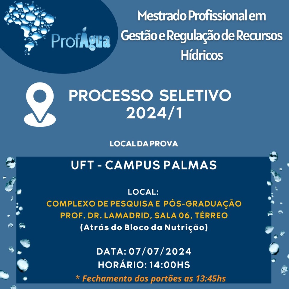 A prova para seleção de alunos para o curso de mestrado profissional em Gestão e Regulação de Recursos Hídricos (ProfÁgua), com ingresso no segundo semestre letivo de 2024, ocorrerá neste domingo (7 de julho), no período da tarde. Os candidatos devem chegar com antecedência, pois os portões do Complexo Lamadrid (onde ocorrerão as avaliações) serão fechadas às 13h45. O Edital desta Seleção de alunos deste mestrado, prevê 22 vagas para o polo na Universidade Federal do Tocantins no Câmpus de Palmas.