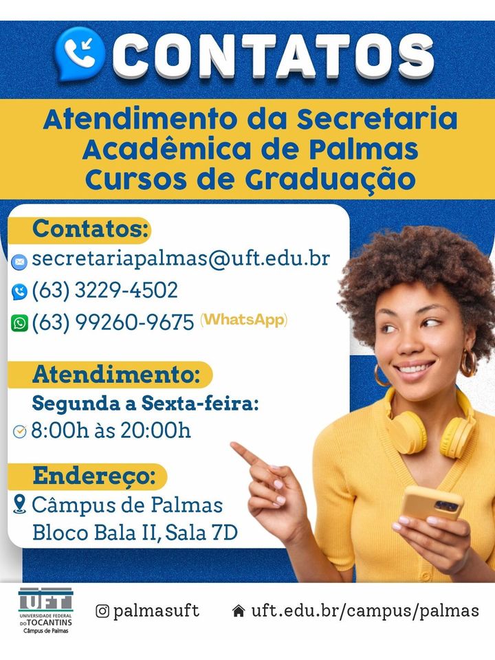 A Secretaria Acadêmica dos cursos de graduação do Câmpus de Palmas, da Universidade Federal do Tocantins (UFT), está com canais de atendimento atualizados, com destaque para a disponibilização de um novo número de WhatsApp, ampliando as possibilidades de contato e tornando a comunicação mais ágil e acessível aos estudantes, servidores e público externo.