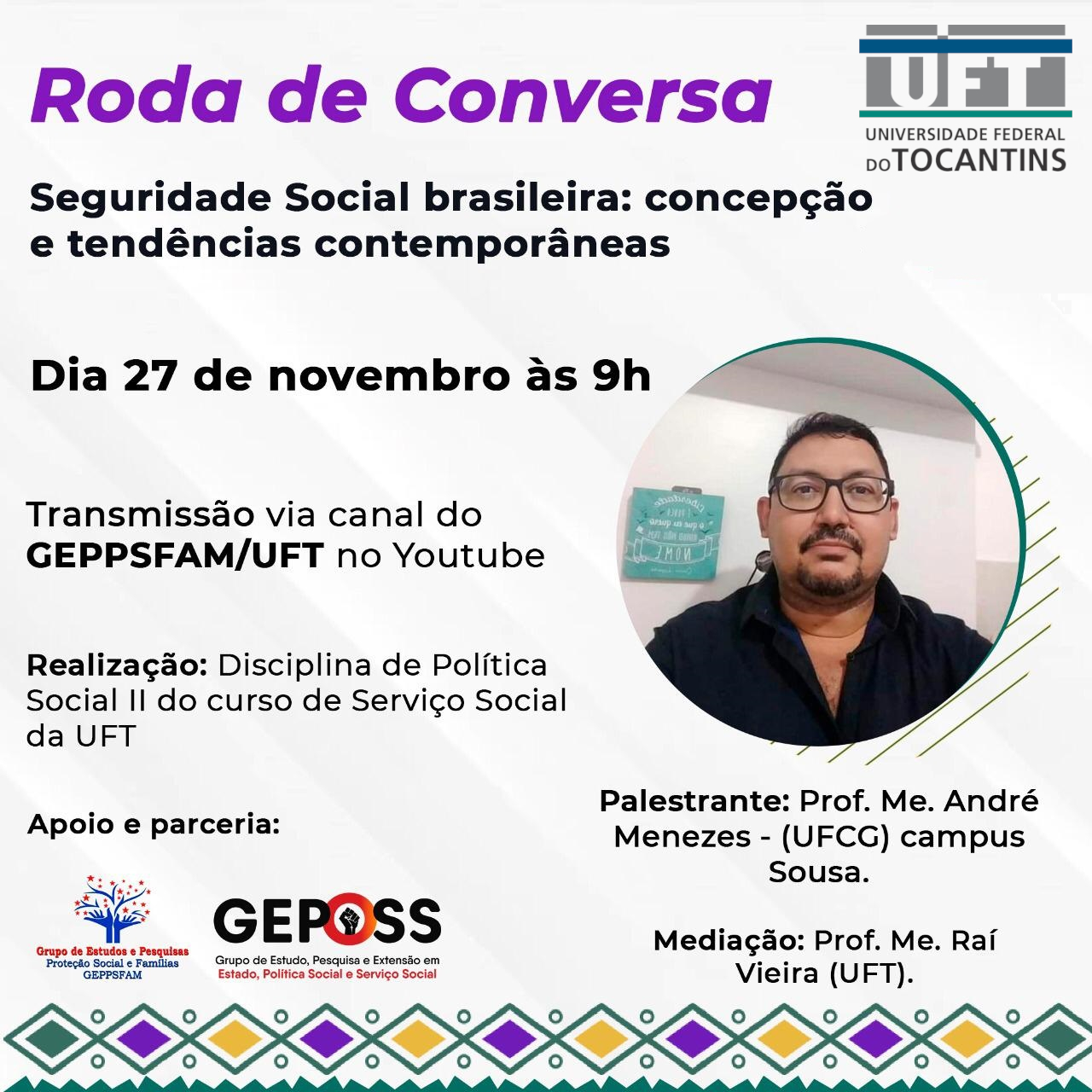 A "Seguridade Social Brasileira: Concepção e Tendências Contemporâneas" será o tema de uma Roda de Conversa nesta sexta-feira (27), promovida pela disciplina de Política Social II do curso de Serviço Social (Câmpus de Miracema), junto com a Pró-Reitoria de Extensão, Cultura e Assuntos Comunitários da UFT (Proex). O palestrante será o professor Me. André Menezes, do Câmpus Sousa da Universidade Federal de Campina Grande (UFCG).
