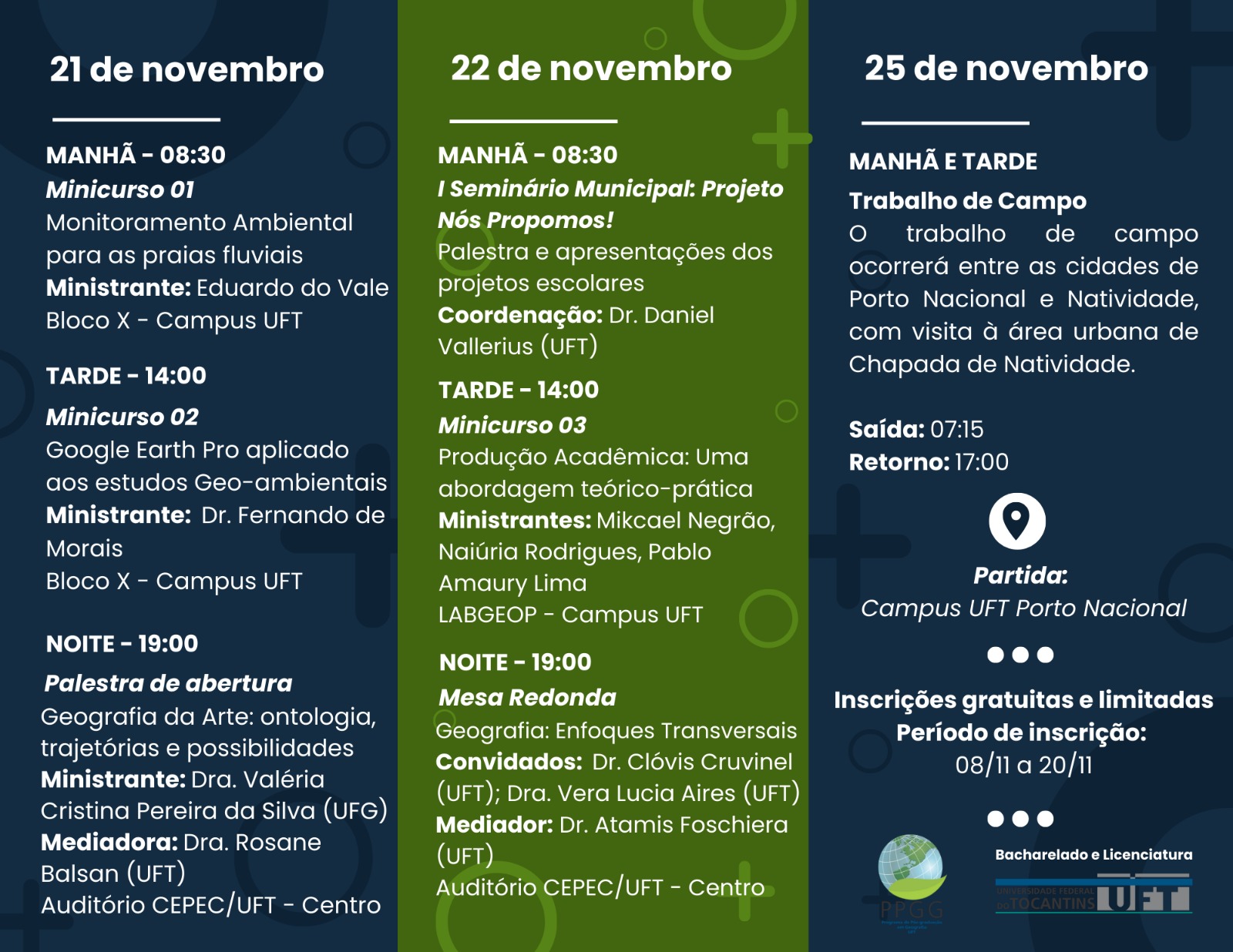 A programação engloba palestra, mesa-Reedonda, minicursos, apresentação de trabalhos do Projeto Nós Propomos! (PIP Geografia) e culmina com um trabalho de campo. Dentro da Semana Integrada de Geografia, será realizado também o I Seminário Municipal do Projeto Nós Propomos!, que compreende escolas de Porto Nacional e está vinculado ao PIP Geografia UFT.