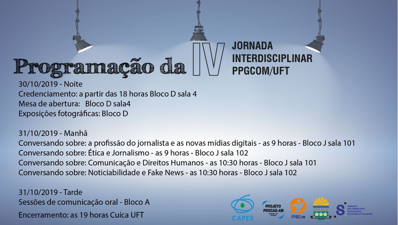 O Programa de Pós-Graduação stricto sensu em Comunicação e Sociedade (PPGCom) da UFT realiza, nos próximos dias 30 e 31 de outubro, a IV Jornada Interdisciplinar. Serão apresentadas 64 pesquisas divididas em 12 diferentes eixos temáticos, exposições fotográficas, apresentações artísticas, além de debates sobre comunicação, cultura, conflitos, a profissão do jornalista e as novas mídias digitais, ética no jornalismo, direitos humanos na comunicação, educação, noticiabilidade e fake news.
