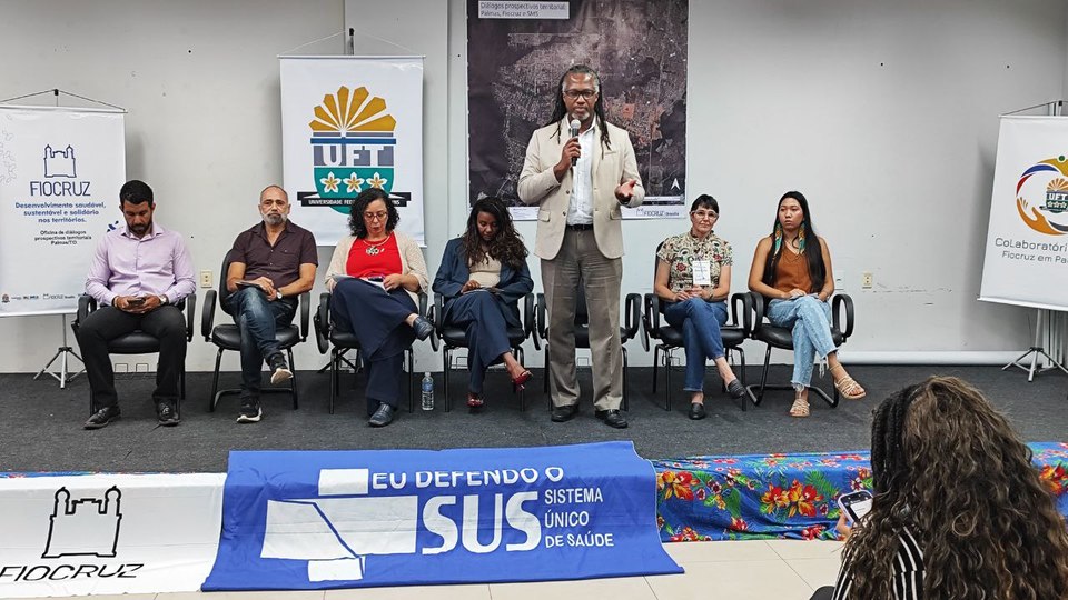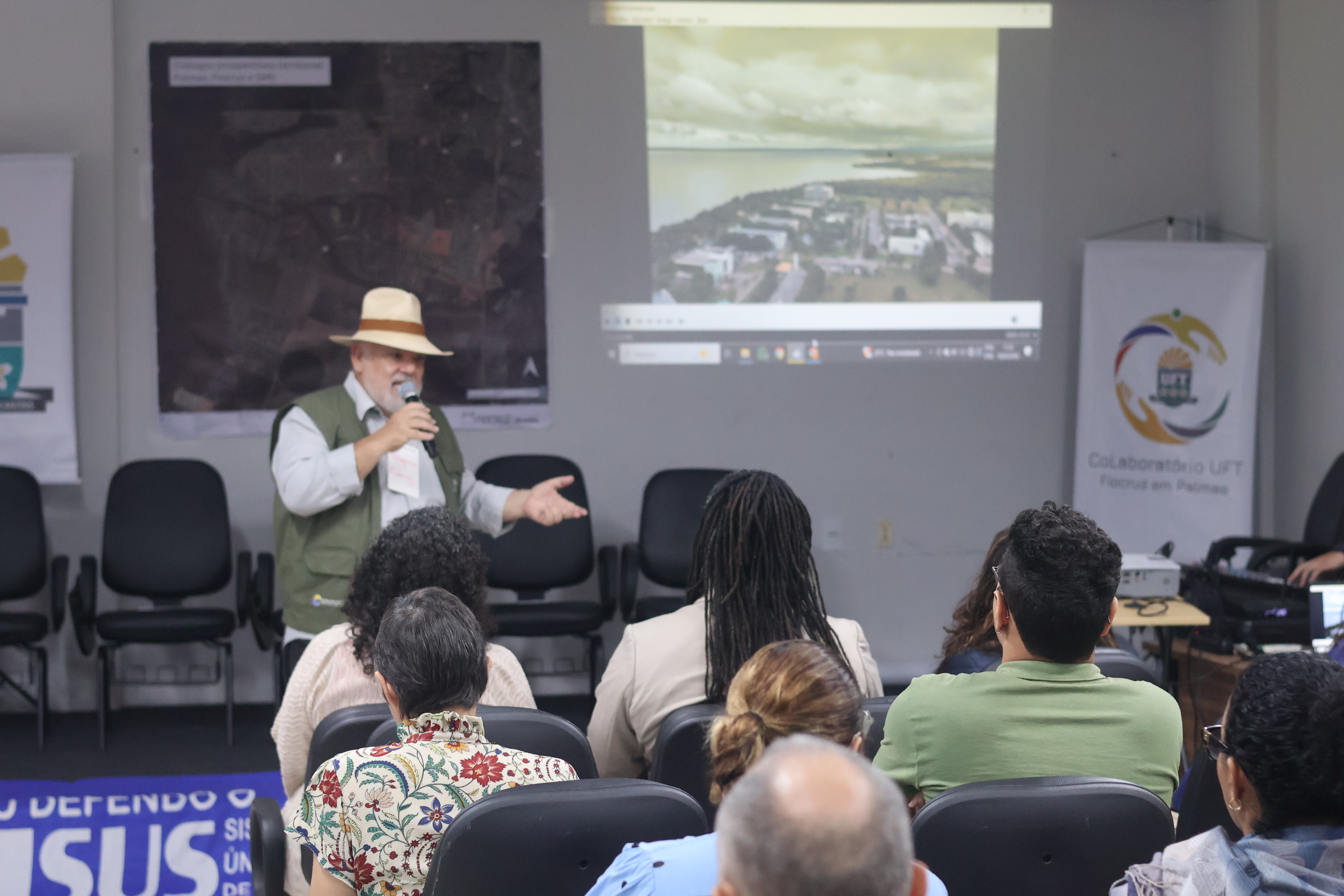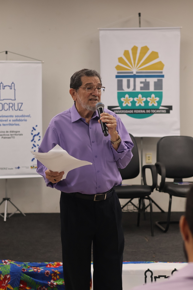 Como parte da solenidade, o assessor do Ministério da Saúde e da Fiocruz e professor aposentado da UFT, Neilton Araújo, apresentou boas-vindas aos presentes e abriu espaço para Wagner Martins, analista de gestão em saúde da Fiocruz Brasília, para que este apresentasse o resultado das oficinas realizadas desde terça-feira (17) no mesmo auditório, com a participação de representantes de comunidades periféricas de Palmas.