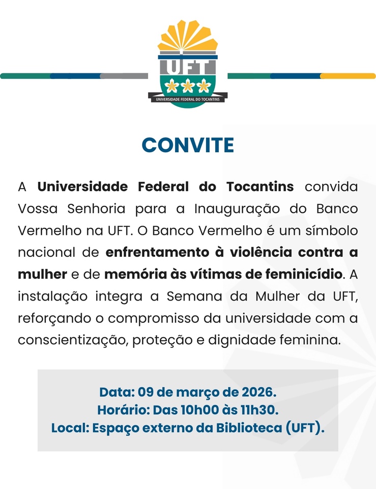 A Universidade Federal do Tocantins (UFT) realiza, no dia 09 de março, às 10h, no hall de entrada da Biblioteca do Câmpus de Palmas, a solenidade de inauguração do Banco Vermelho. O ato marca a adesão institucional à Campanha Banco Vermelho, movimento nacional de combate à violência contra a mulher.