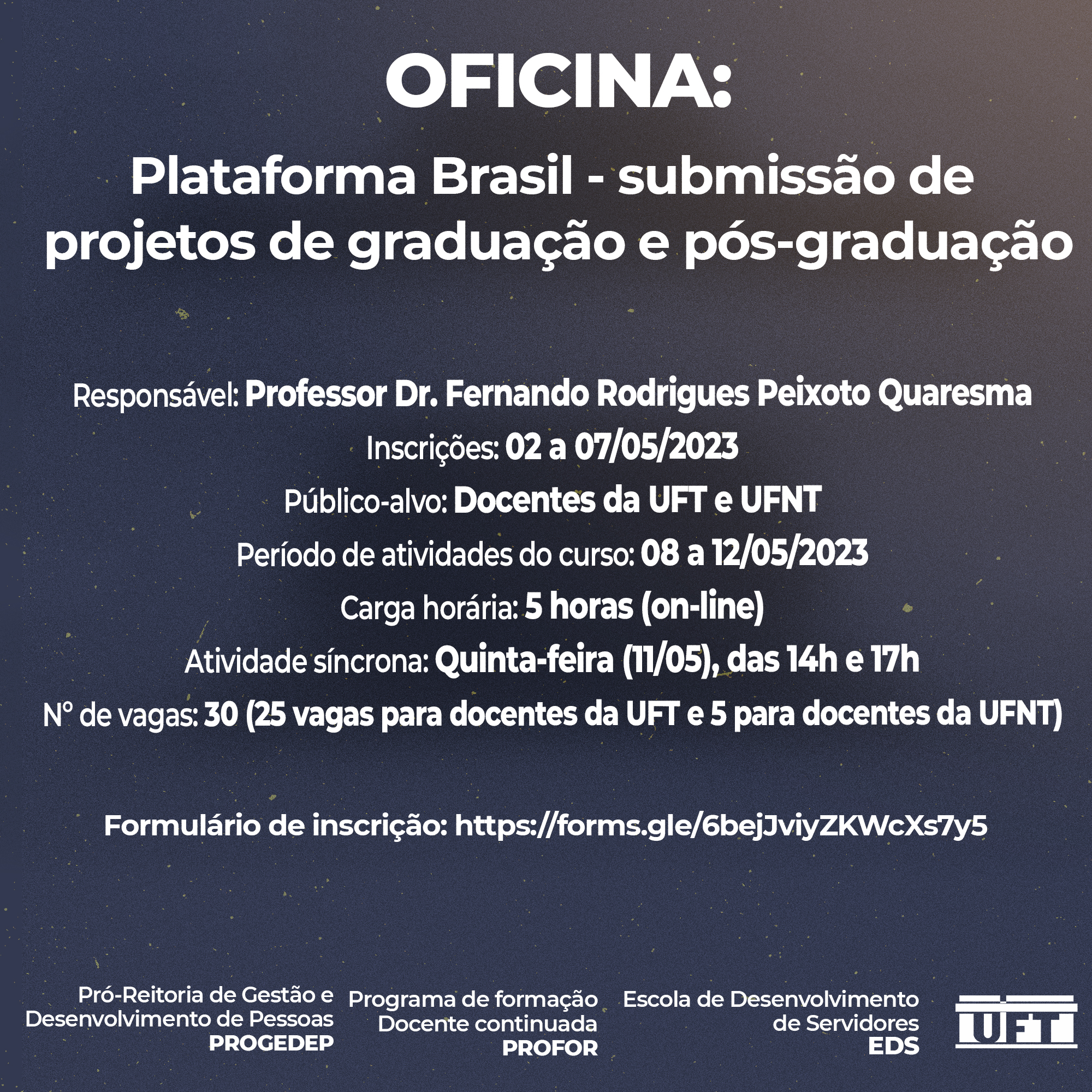 A Pró-Reitoria de Gestão e Desenvolvimento de Pessoas (Progedep) da Universidade Federal do Tocantins, por meio do Programa de Formação Docente Continuada (Profor), está com inscrições abertas para a oficina virtual "Plataforma Brasil - submissão de projetos de graduação e pós-graduação". São ofertadas 30 vagas, sendo 25 para docentes da UFT e 05 para docentes da UFNT.