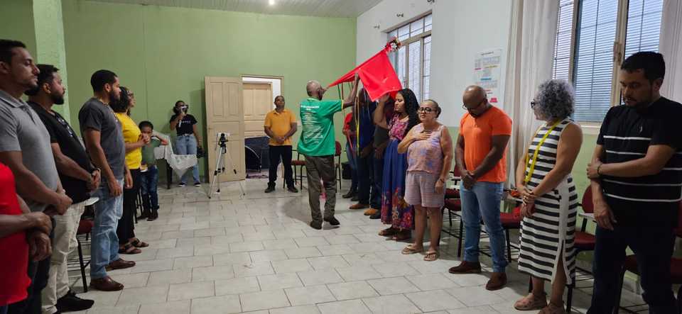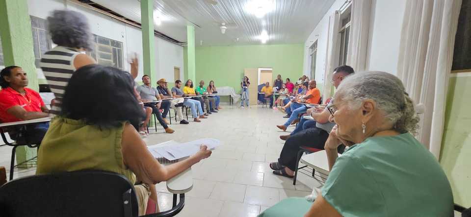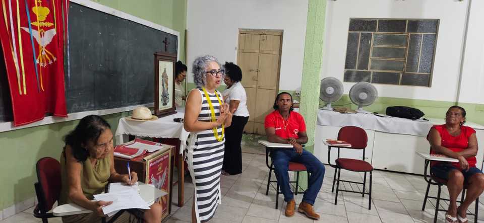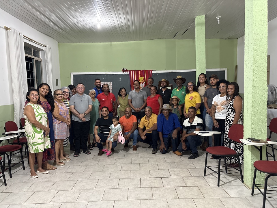 - Fotos (1, 2, 3, 4 e 5) da reunião com o padre, Imperador e Imperatriz, Capitão e Rainha do Mastro, despachantes e coordenadores (responsáveis pelas três folias) e demais pessoas da comunidade, com objetivo organizar e preparar o giro das folias; reunião realizada dia 23/01/2026, no Salão Paroquial em Natividade. - Fotos autoria: Simone Camelo.