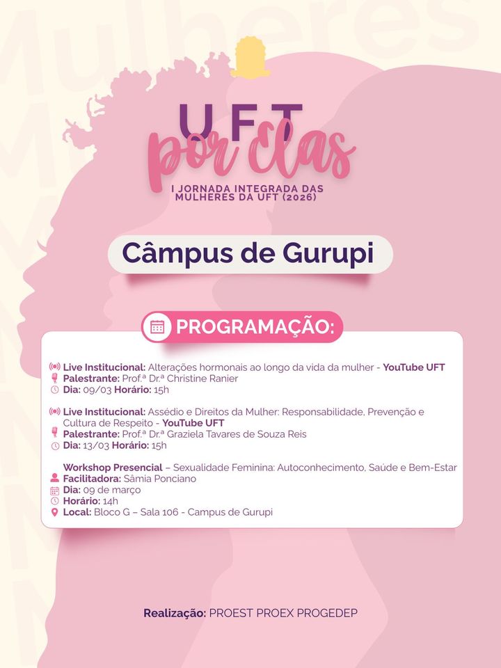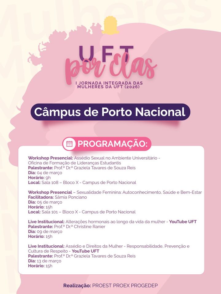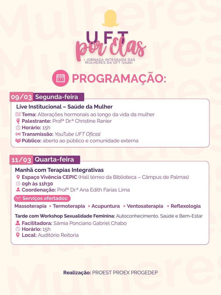 A Universidade Federal do Tocantins (UFT) realiza, entre os dias 4 e 13 de março, a UFT por Elas - I Jornada Integrada das Mulheres da UFT 2026. Aberta ao público, a iniciativa integra as ações institucionais alusivas ao Dia Internacional da Mulher, celebrado em 8 de março.