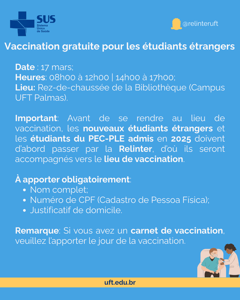 O Câmpus de Palmas da Universidade Federal do Tocantins (UFT) promove, no dia 17 de março, uma ação de vacinação gratuita para estudantes estrangeiros da instituição. A atividade ocorre no térreo da Biblioteca do câmpus, das 8h às 12h e das 14h às 17h. A ação é organizada pelo curso de enfermagem do Câmpus de Palmas, em parceria com a Cepic e com a Secretaria de Assuntos Internacionais e Cooperação Global (Relinter). E os professores Mirian Cristina dos Santos Almeida e Ulisses Vilela Hipólito do curso de enfermagem.