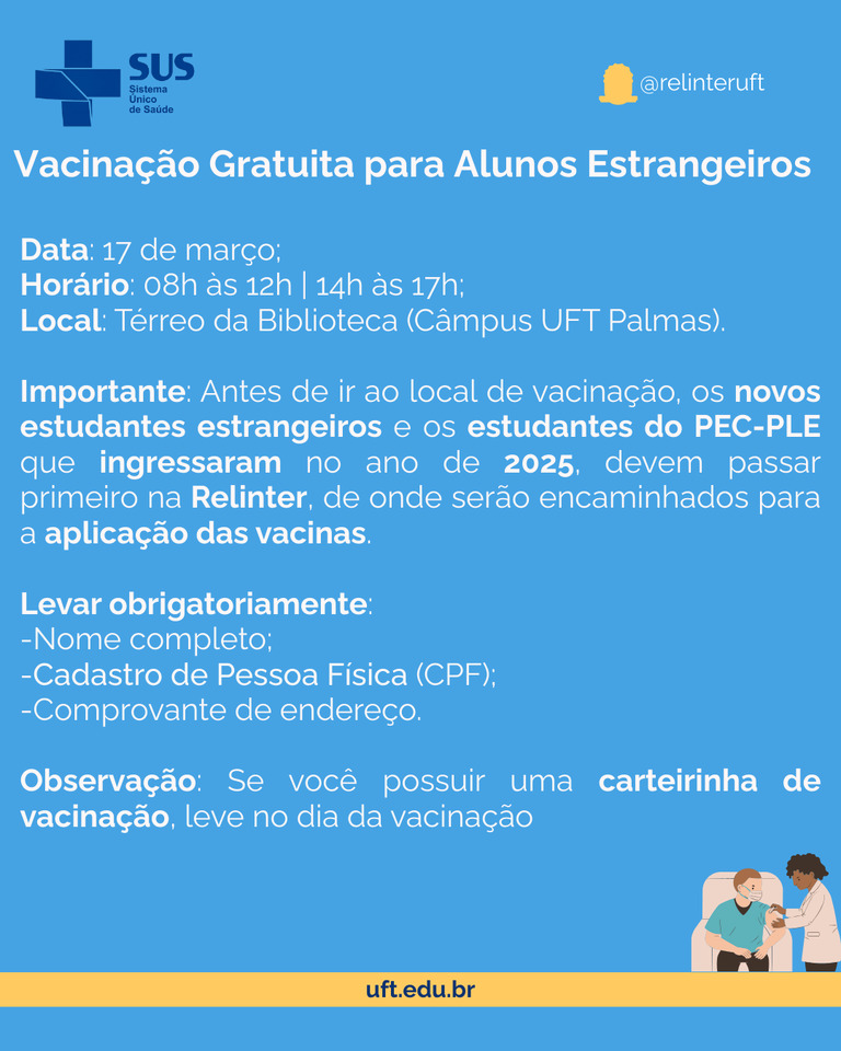 Estudantes estrangeiros e acadêmicos do Programa de Estudantes-Convênio de Português como Língua Estrangeira (PEC-PLE), que ingressaram em 2025, devem procurar a Relinter para receber orientações sobre o local de vacinação. No dia da vacinação, os estudantes devem apresentar nome completo, CPF e comprovante de endereço. Quem tiver carteira de vacinação devem levá-la para facilitar a verificação.