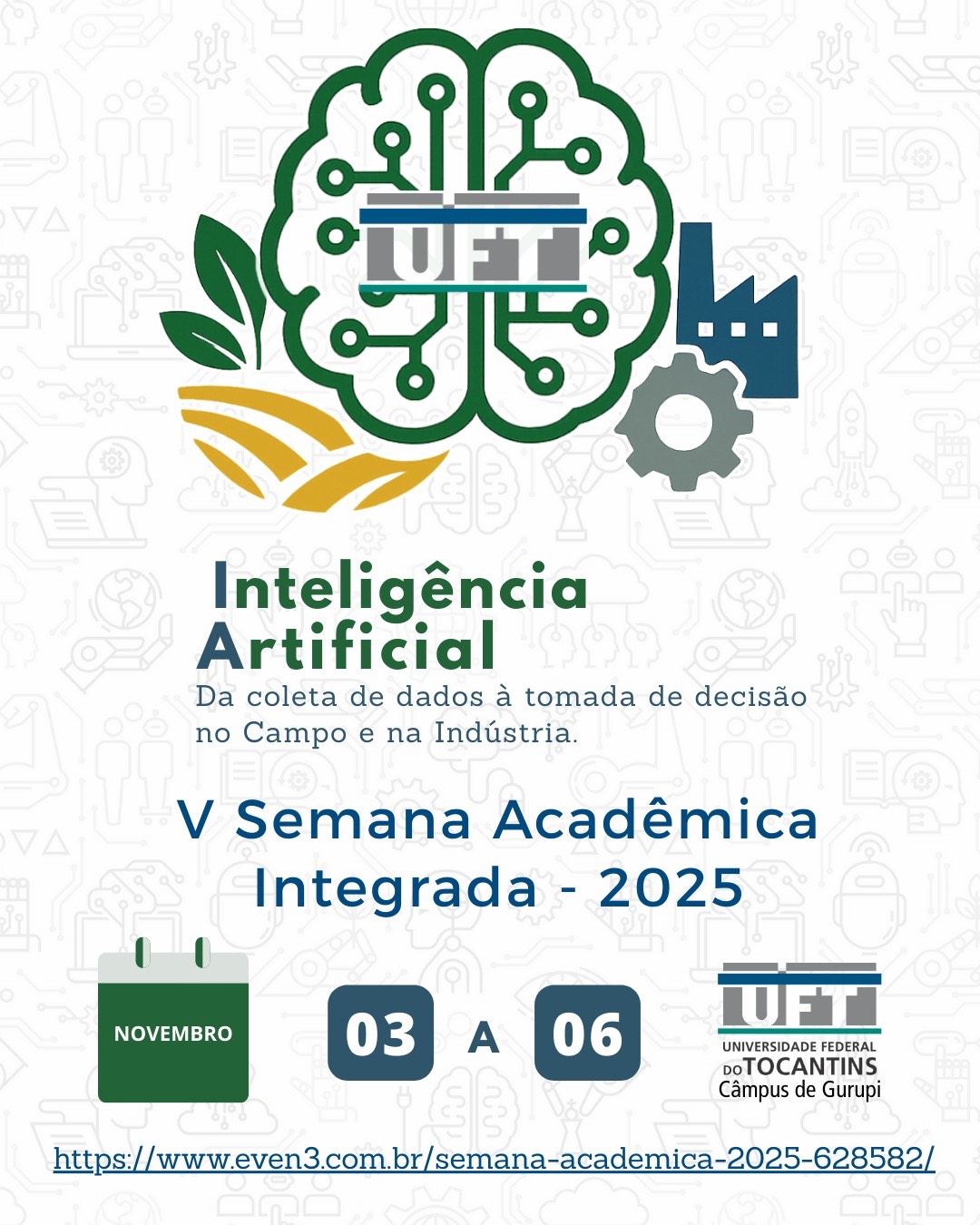 Durante os dias 3 a 6 de novembro, o Câmpus de Gurupi realiza a V Semana Acadêmica Integrada. A programação inclui palestras, minicursos, apresentações científicas e rodas de conversa, reunindo os cursos de Agronomia, Engenharia de Bioprocessos e Biotecnologia, Engenharia Florestal, Medicina Veterinária, Química Ambiental, Licenciatura em Química e Agroindústria, com participação dos programas de Pós-Graduação. As inscrições estão abertas até 3 de novembro e são gratuitas pelo site do evento.