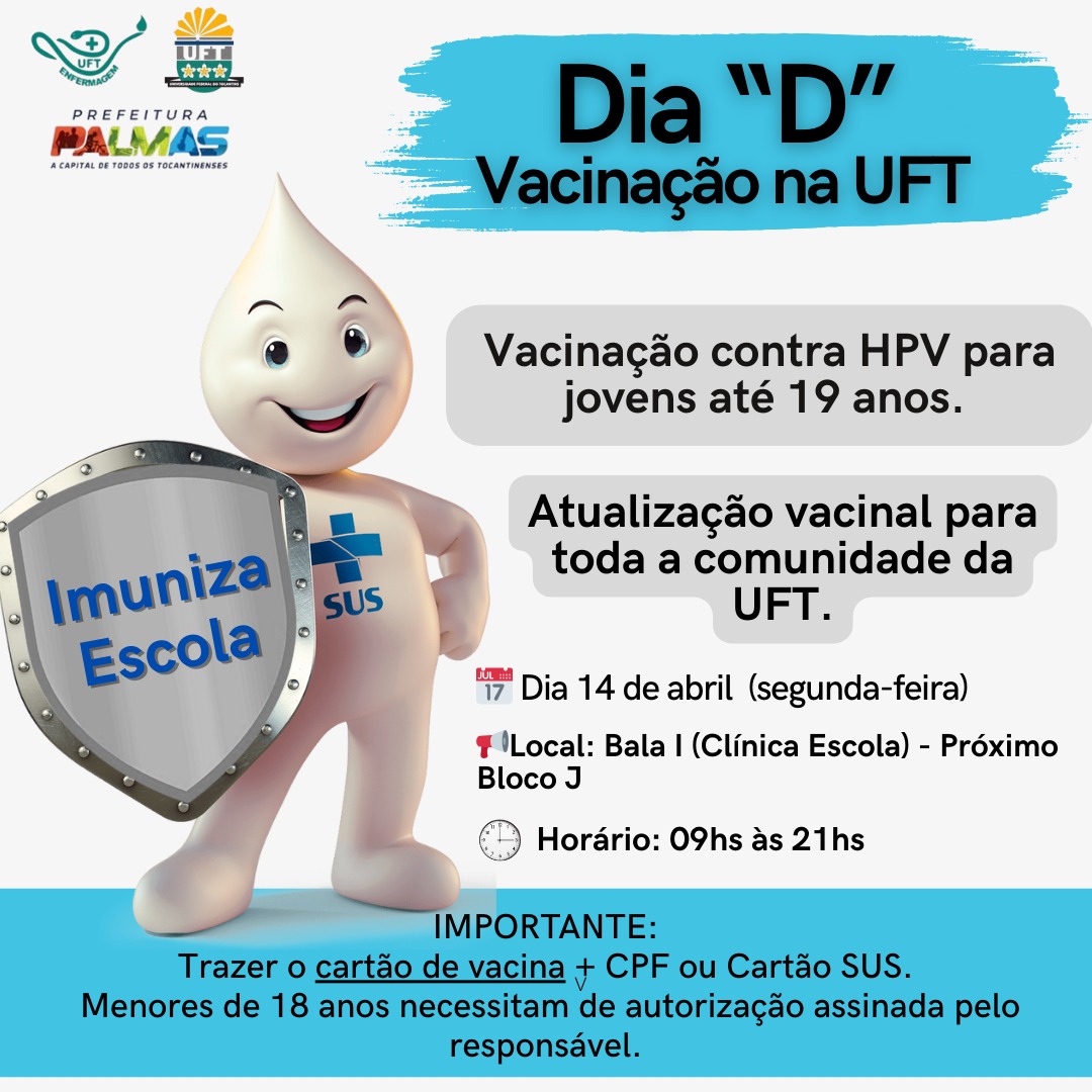 A Universidade Federal do Tocantins (UFT), por meio do curso de Enfermagem, em parceria com a Secretaria Municipal de Saúde de Palmas, realizará no dia 14 de abril o Dia D de Vacinação contra o HPV, destinada a jovens de até 19 anos, e a atualização vacinal para toda a comunidade universitária. A ação será realizada no Câmpus de Palmas, no Bloco Bala I (Clínica Escola), próximo ao Bloco J, das 9h às 21h.