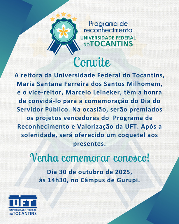Em comemoração ao Dia do Servidor Público, a Universidade Federal do Tocantins (UFT) preparou uma cerimônia especial que será realizada no dia 30 de outubro de 2025, às 14h30, no Câmpus de Gurupi.
