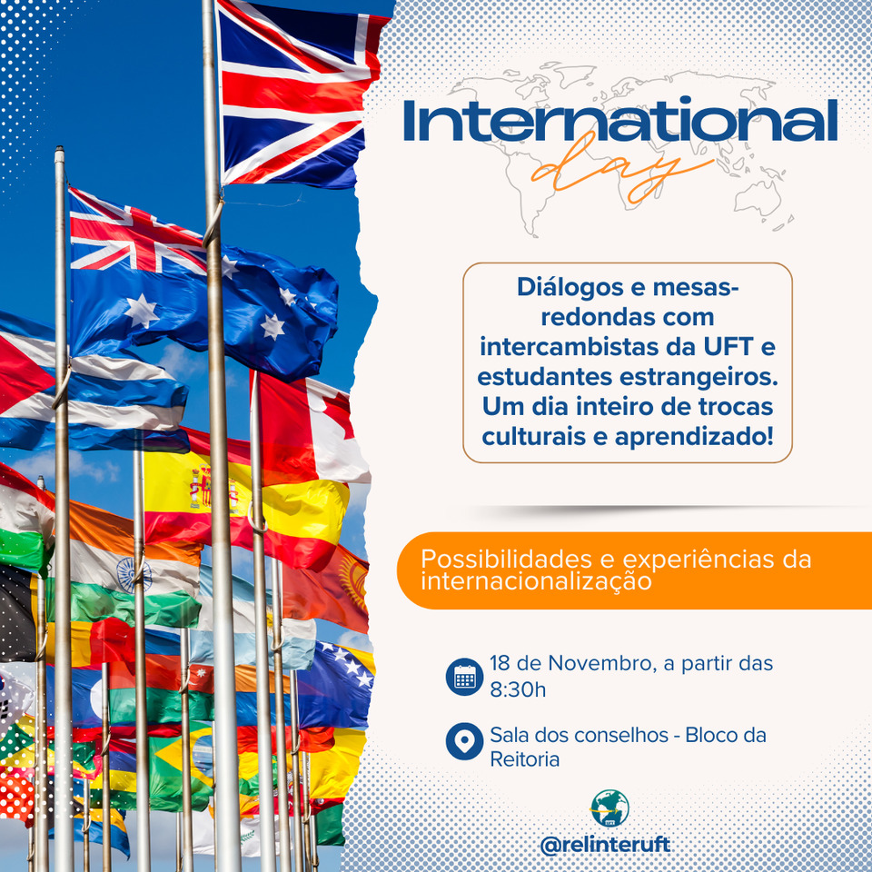 A Universidade Federal do Tocantins (UFT) realizará, no dia 18 de novembro de 2025, o I International Day UFT: possibilidades e experiências da internacionalização, um evento voltado ao diálogo intercultural, aprendizado mútuo e fortalecimento do acolhimento à comunidade acadêmica internacional.