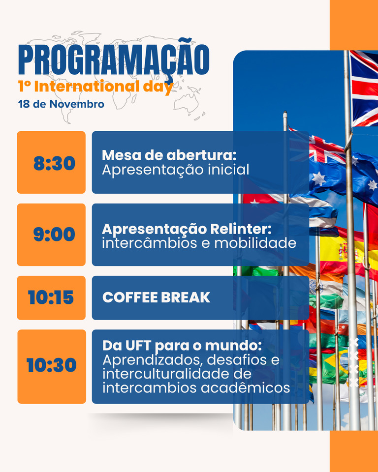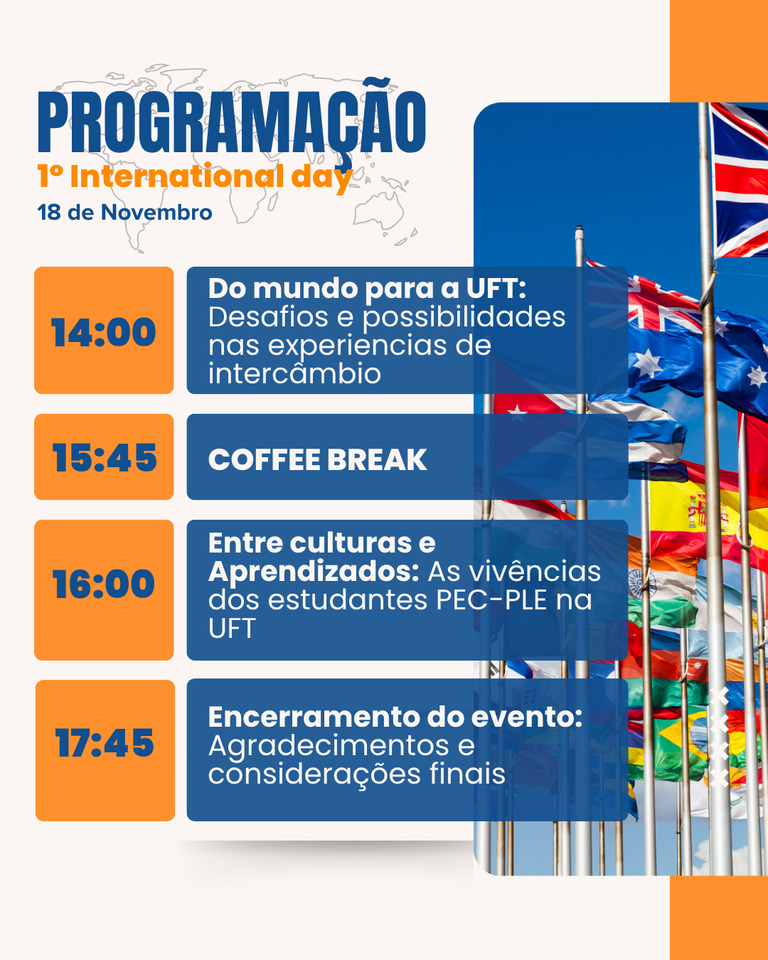 A programação ocorrerá das 8h às 18h, na Sala dos Conselhos da UFT (Câmpus Palmas), e reunirá estudantes, docentes e técnicos-administrativos interessados em vivências internacionais e na integração entre diferentes culturas.