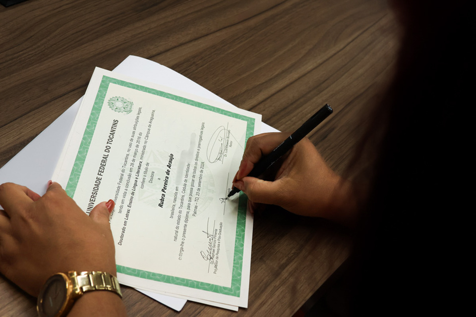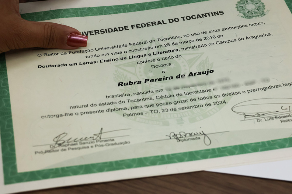 A Universidade Federal do Tocantins (UFT) realizou, no dia 24 de setembro de 2024, a entrega da segunda via dos diplomas de mestrado e doutorado da professora Rubra Pereira de Araújo, vinculada aos colegiados da graduação e da pós-graduação em Letras. O momento histórico marca a primeira retificação de nome civil em diplomas na UFT. Em respeito aos direitos humanos, à pluralidade e à dignidade da pessoa humana, a Universidade vai publicar uma Portaria Normativa isentando pessoas trans do pagamento da taxa de requerimento da segunda via de diploma em casos de alteração de nome civil, com o objetivo de otimizar o procedimento.