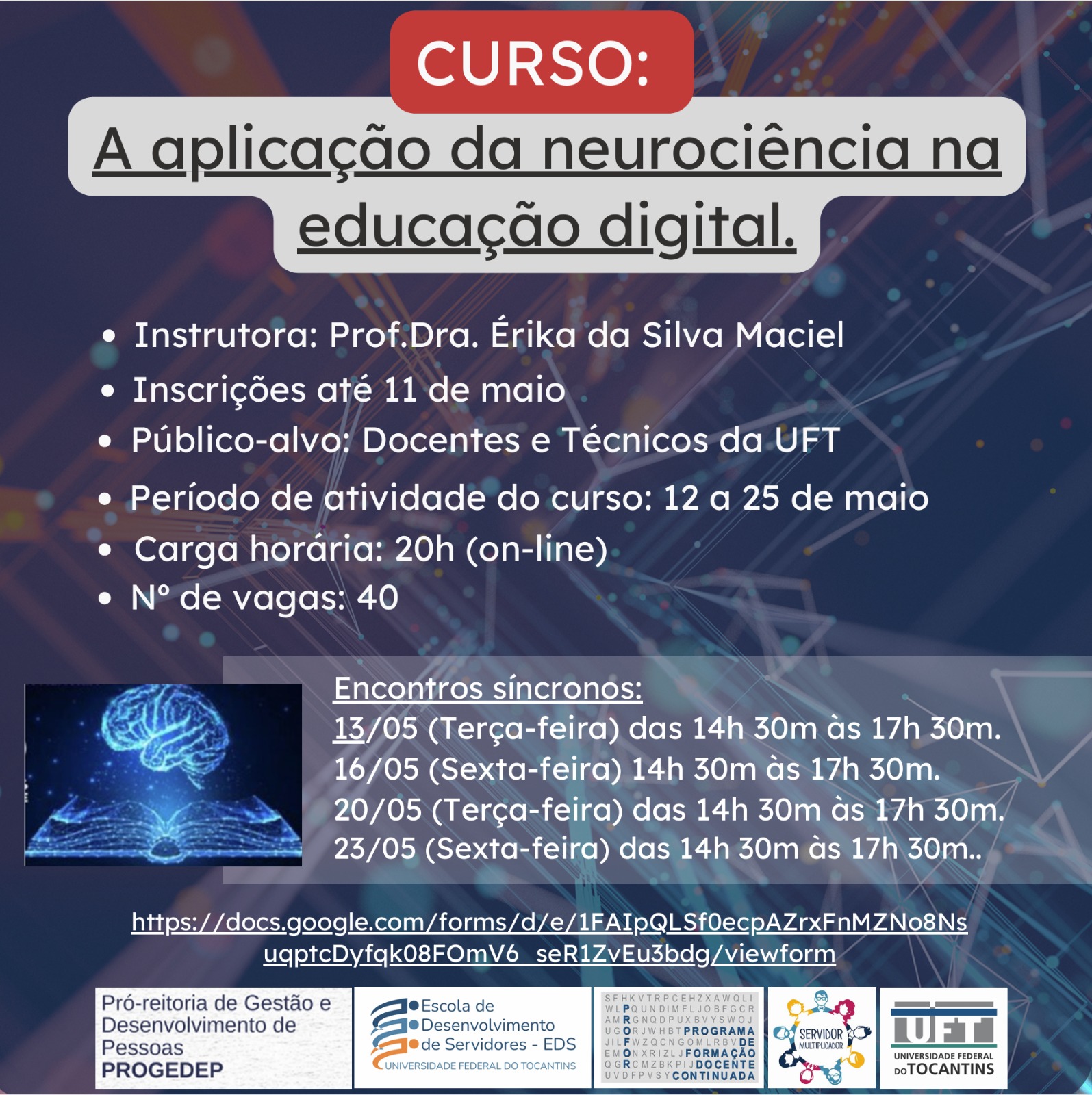 A Escola de Desenvolvimento de Servidores (EDS), vinculada à Pró-Reitoria de Gestão e Desenvolvimento de Pessoas (Progedep), promove o curso por meio do Programa de Formação Docente Continuada (Profor) e do Programa Servidor Multiplicador TAE da UFT. O curso tem como objetivo desenvolver habilidades técnicas e socioemocionais que contribuam para a compreensão da neurociência aplicada à educação digital, com foco na melhoria da qualidade do ensino.