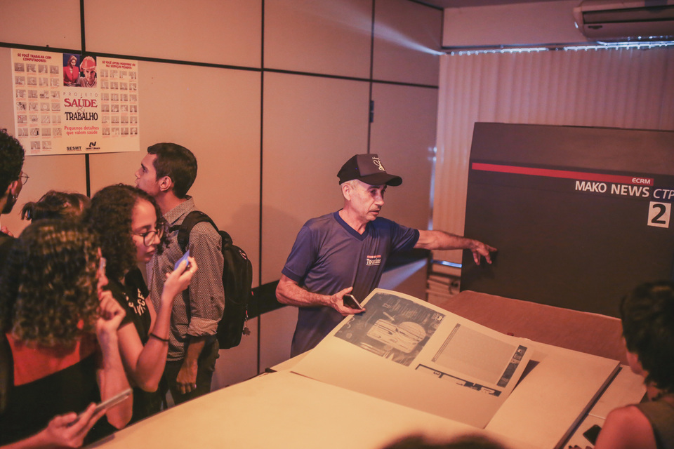 João Maciel, que é o responsável por manusear o instrumento de impressão, falou um pouco sobre a história do equipamento. " Essa máquina é de 1970 e é a única que existe no Brasil, antes eram produzidos mais de 37 mil jornais por dia, hoje somente cerca de 7 mil. Eu senti a escassez do jornal impresso devido ao surgimento do jornal online, caiu a tiragem e foi diminuindo a demanda, alguns colegas foram desligados da emissora devido a baixa procura pelo material", esclareceu João